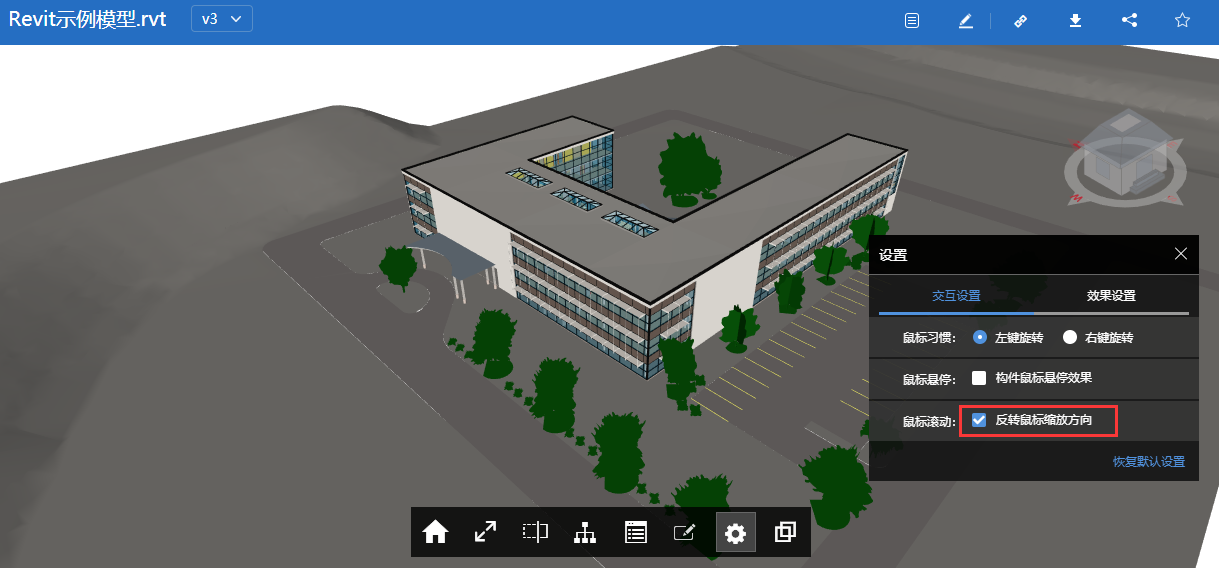 1)交互设置方面:新增模型交互设置中鼠标悬停效果的控制开关,打开后鼠标悬停在构件上会高亮突出显示;新增模型交互设置鼠标滚轮缩放方向控制开关,可以根据喜好设定滚轮控制缩放的方向;