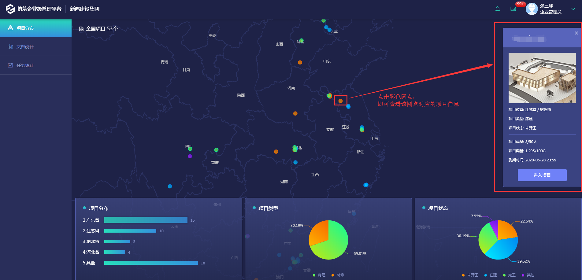 在地图上点击彩色圆点,右侧会展示该圆点对应的项目面板,点击进入项目,会直接跳转到该项目空间,进而可以访问该项目文档、BIM、任务数据等。