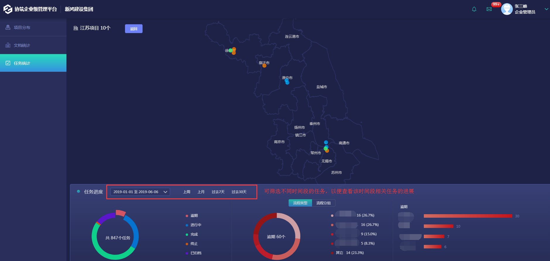 任务统计页面按照地区统计企业下属项目任务的更新情况,并按照任务状态、流程类型和当前执行人进行归类显示。