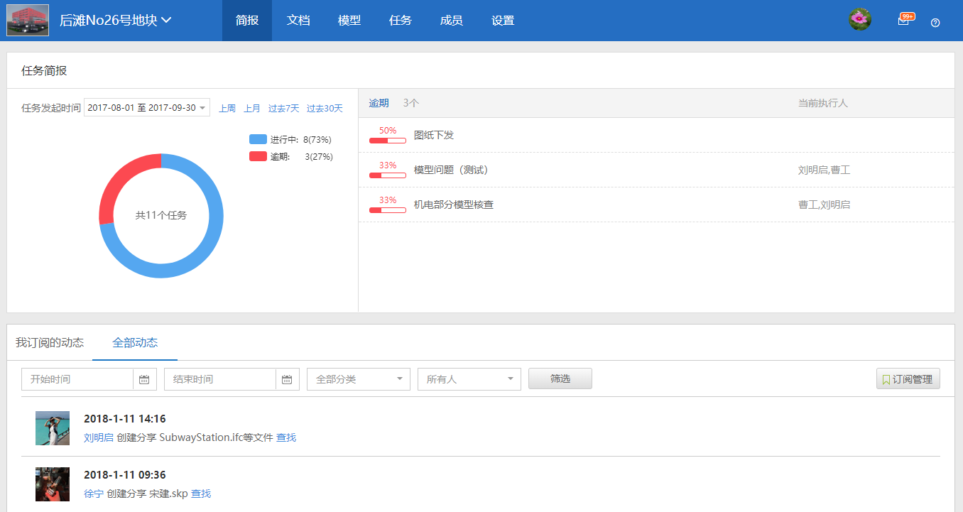 1.2  简报页新增展示项目任务统计数据的功能,便于了解项目的任务整体进展状态,目前支持按照时间段统计“完成”“已逾期”“进行中”任务数,并展示逾期任务;